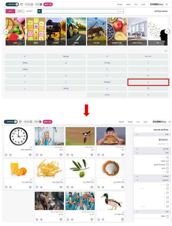 באפשרותכם לעבוד עם פעילויות מוכנות מראש, המסודרות לפי צלילים ספציפיים או תהליכים פונולוגיים.