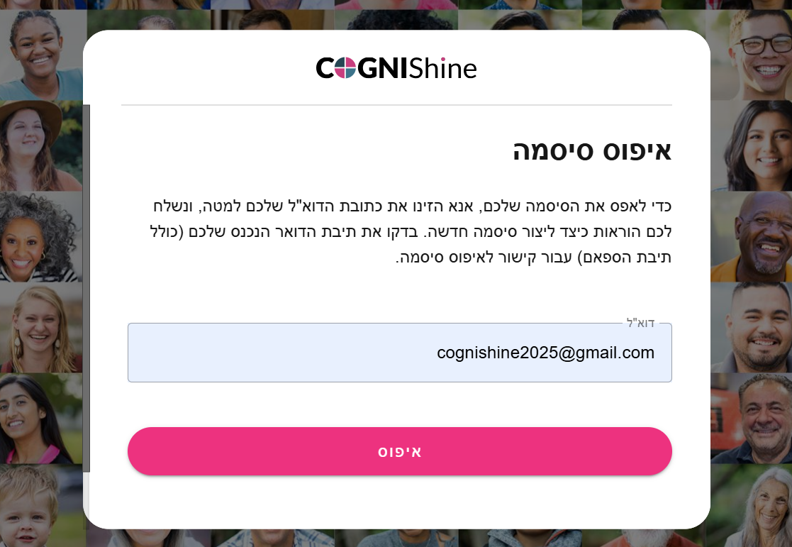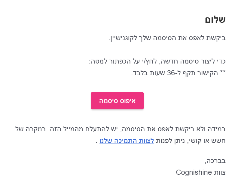 בדקו את תיבת הדוא"ל שלכם, תקבלו הודעה עם קישור לאיפוס הסיסמה.