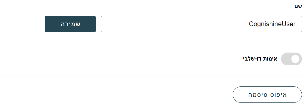 לחצו על "איפוס סיסמה" והזינו סיסמה חדשה. אשרו את הסיסמה החדשה בלחיצה על "שינוי סיסמה".