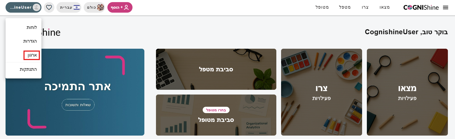 כדי להיכנס להגדרות ניהול הארגון, לחצו על שם המשתמש בפינה השמאלית העליונה ובחרו באפשרות ארגון.