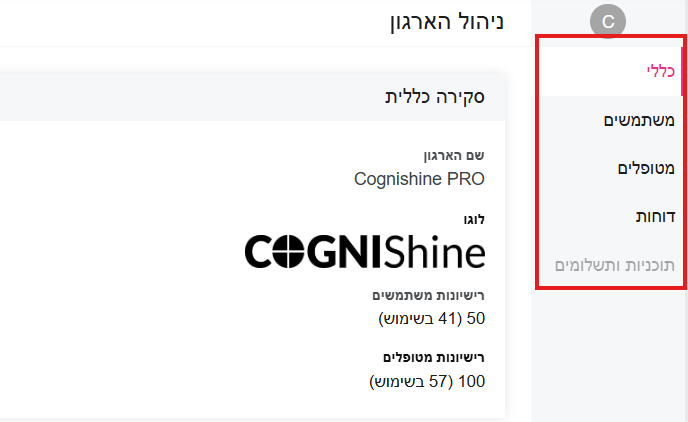לאחר הכניסה, יוצגו בצד ימין מסכי ניהול הארגון השונים.