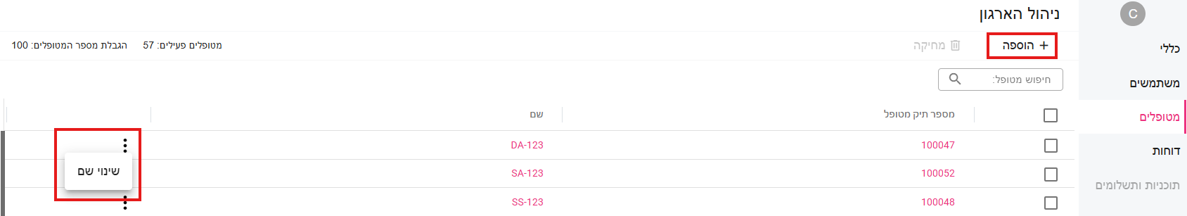 מסך זה מציג את כל המטופלים המשויכים לארגון. ניתן להוסיף מטופלים חדשים, לשנות שמות, לחפש מטופלים קיימים או למחוק מטופלים מהמערכת.