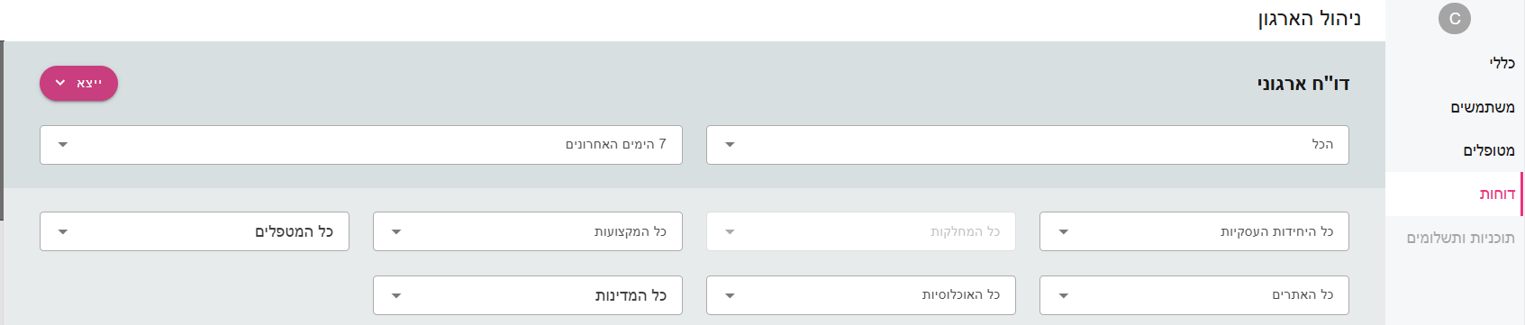 מסך זה מאפשר יצירה וייצוא של דוחות שימוש מפורטים, המשקפים את פעילות הארגון בפלטפורמה.