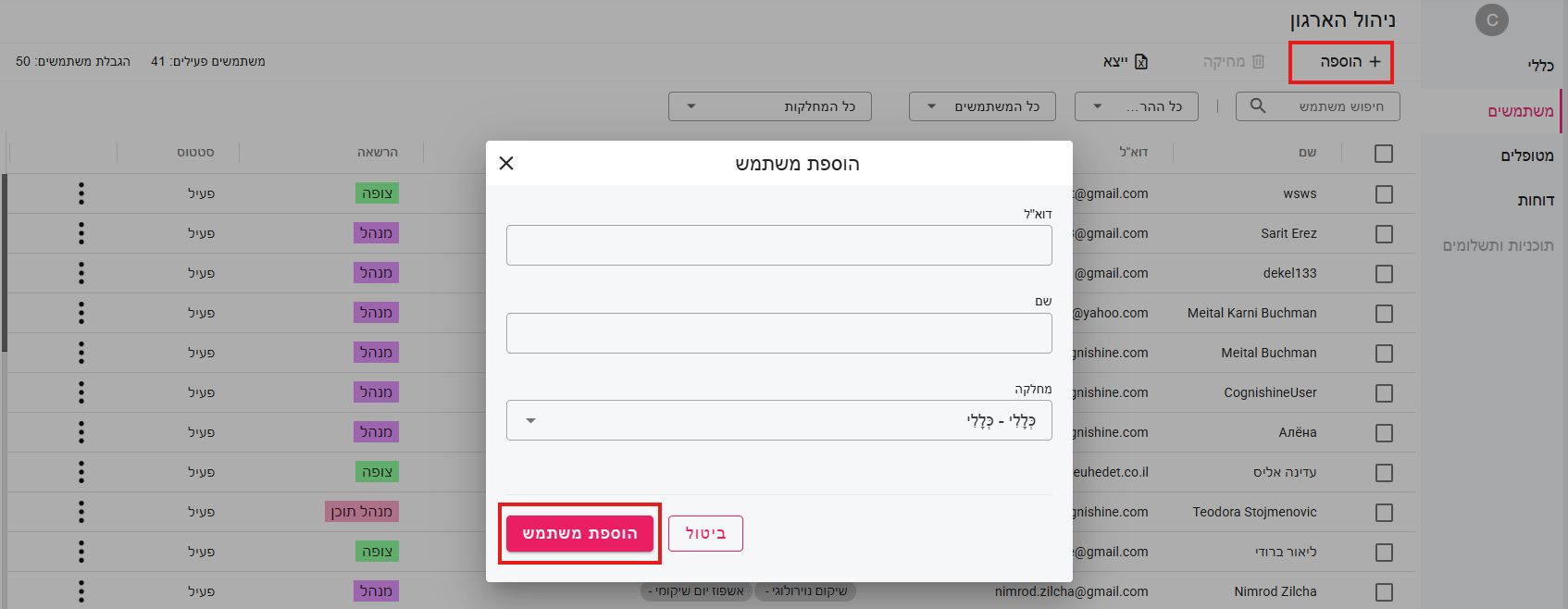 לחצו על "הוספה”. לאחר מכן תתבקשו להזין את כתובת האימייל, השם והמחלקה של המשתמש.