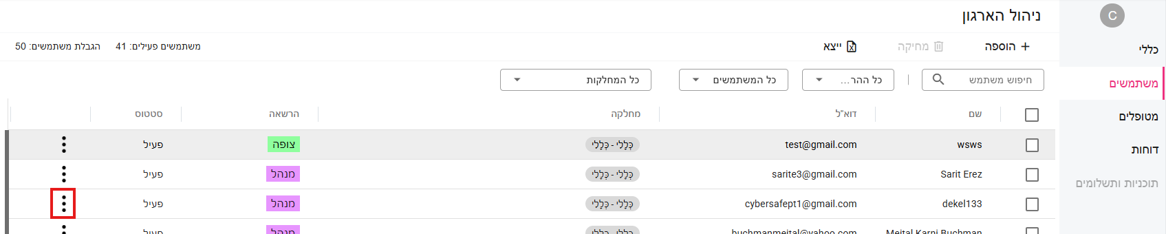 בלחיצה על שלוש הנקודות בצד שמאל במסך "משתמשים”, ניתן לערוך פרטי משתמש, לשלוח מחדש הזמנה למשתמשים שטרם נרשמו, ולשנות את הרשאות החשבון שלהם (כלומר להעביר בין מנהל תוכן, צופה ומנהל).