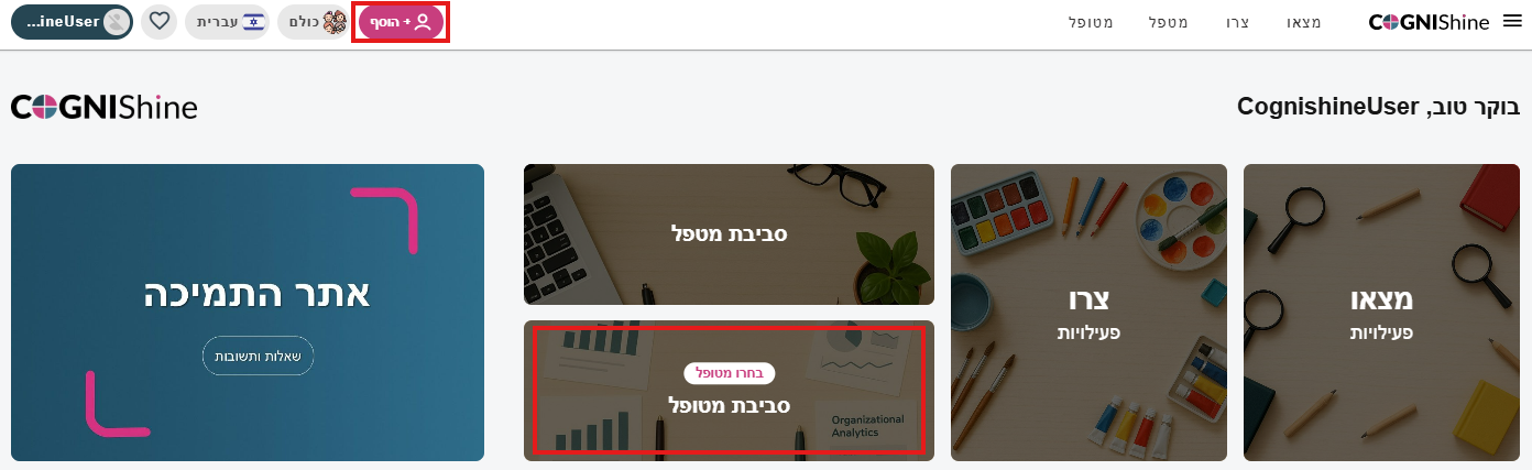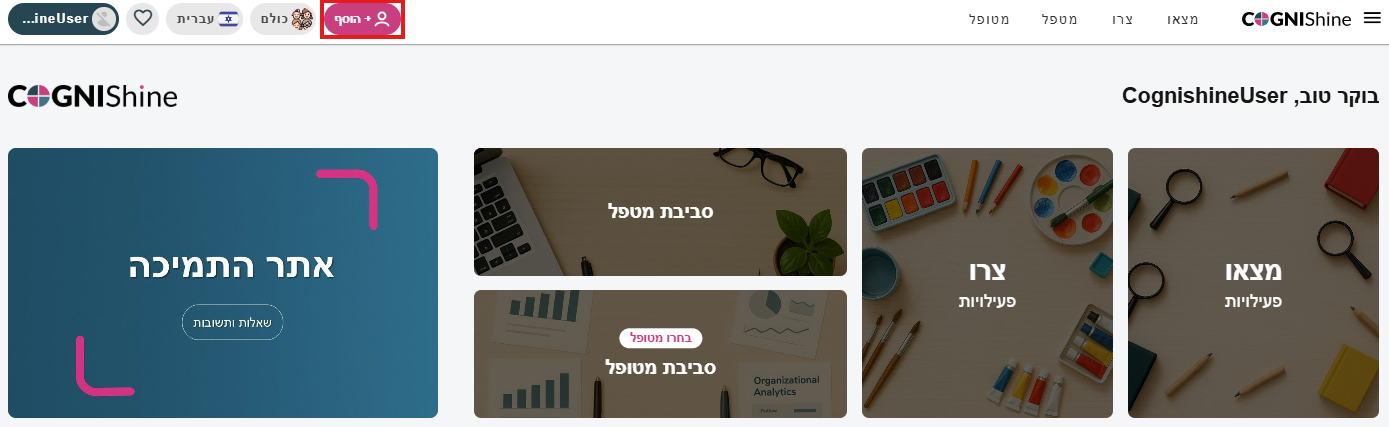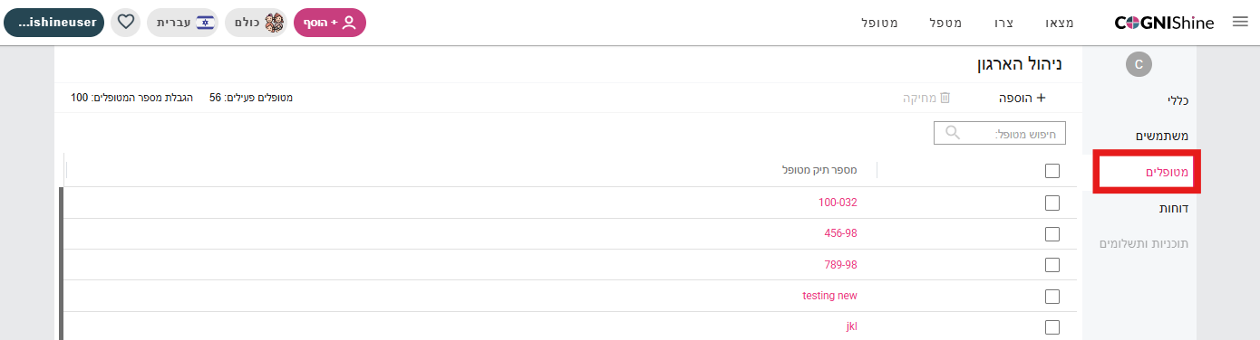 בכדי להוסיף מטופל למערכת, לחצו על כפתור + הוסף בסרגל העליון.
