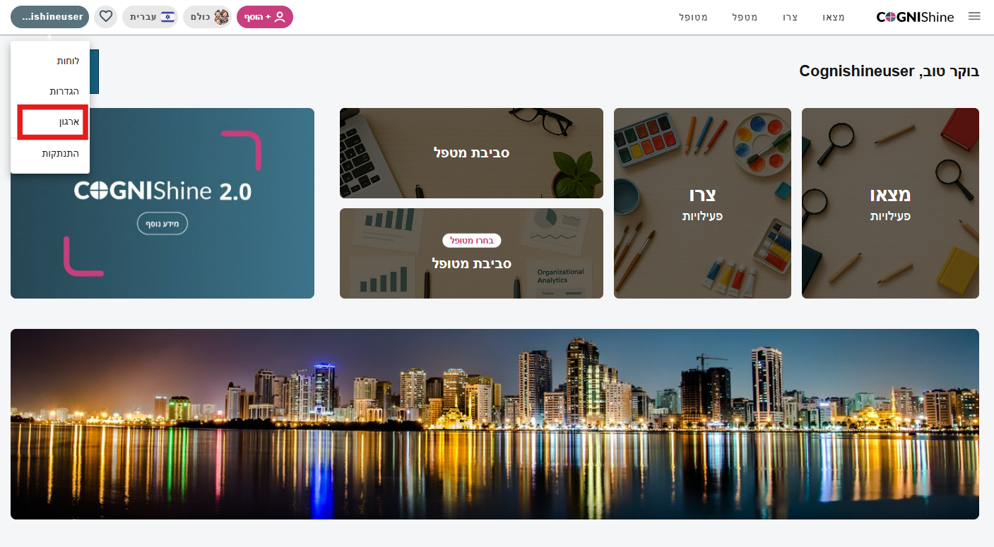 לחצו על שמכם בפינה השמאלית העליונה של המסך כדי לפתוח את התפריט. בתפריט שנפתח, בחרו באפשרות "ארגון".