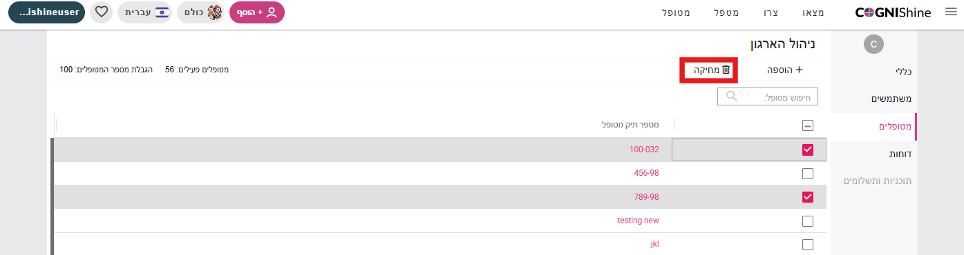 שימו לב: רק משתמשים בעלי הרשאות מנהל בארגון יכולים לבצע מחיקה של חשבונות מטופלים.
